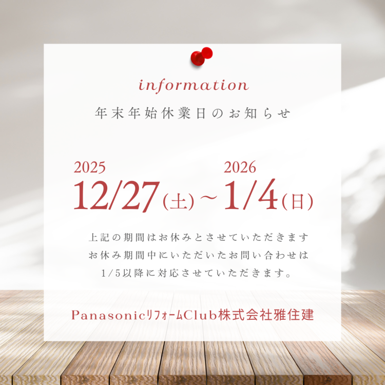 12月27日(土)~1月4日(日) の期間、年末年始休業とさせていただきます。